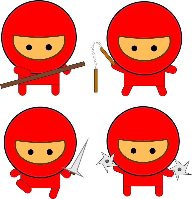 I also had to create the weapons for each of the ninjas as well. I created a long thin rectangle, colored in dark brown, for the stick. I used the star shape tool for the throwing weapons. Clicking on the star, I moved the points into different directions to make the weapon look accurate and the solid circle in center. For the sword, I used the pen tool instead to create prefect triangular shape for the blade, and a three-sided shape to represent the chamfer. The two Numchuk handles part was the hardest until I found out I forgot to click “Object > Blend > Make”. I grouped all of the weapons except for the stick. I adjusted the sizes whenever I needed.